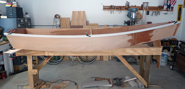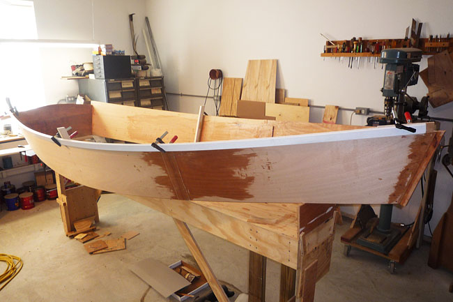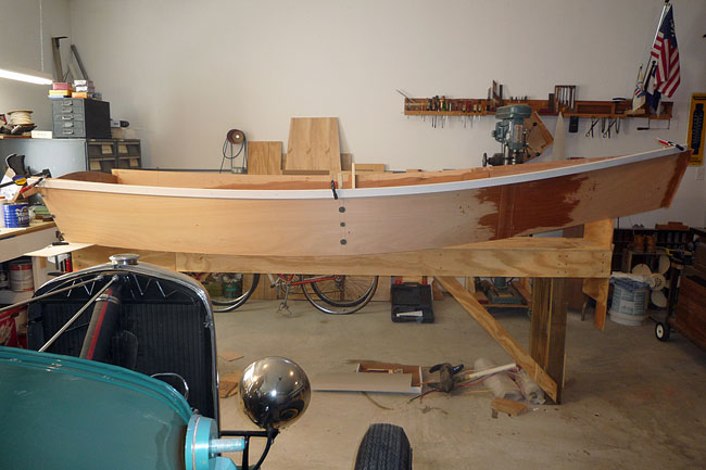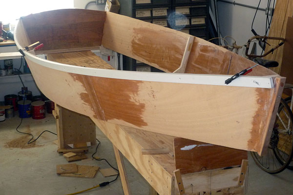 Since discovering that I'm building the boat BACKWARDS(!), and have so much plywood cut, and so much of the boat stuck togeter with epoxy, I've decided to continue by simply scribing and cutting new gunwales. I'll probably need to alter the boat's keel design to "keep it on track" when rowing.