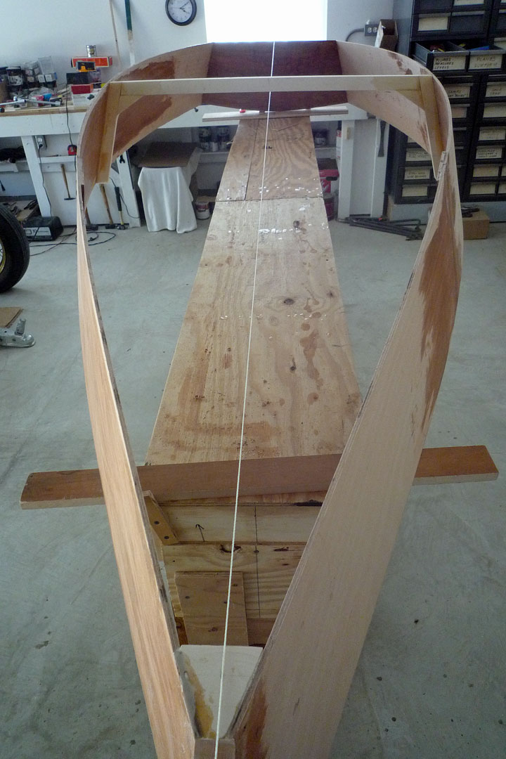 The string will help me line up the hull, and measure for two additional frames. (needed, I think, because of 1/4 inch ply skin.)