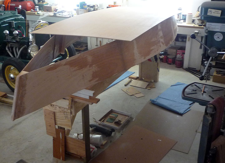 After cutting out the two bottom pieces, they were carefully located, using the restration marks, and weighted (instesd of using nails) to hold them in place on the floor. 3 inch 'glass tape wetted out with epoxy were used to join the two pieces. Only one side was taped. I'll tape the other side tomorrow.