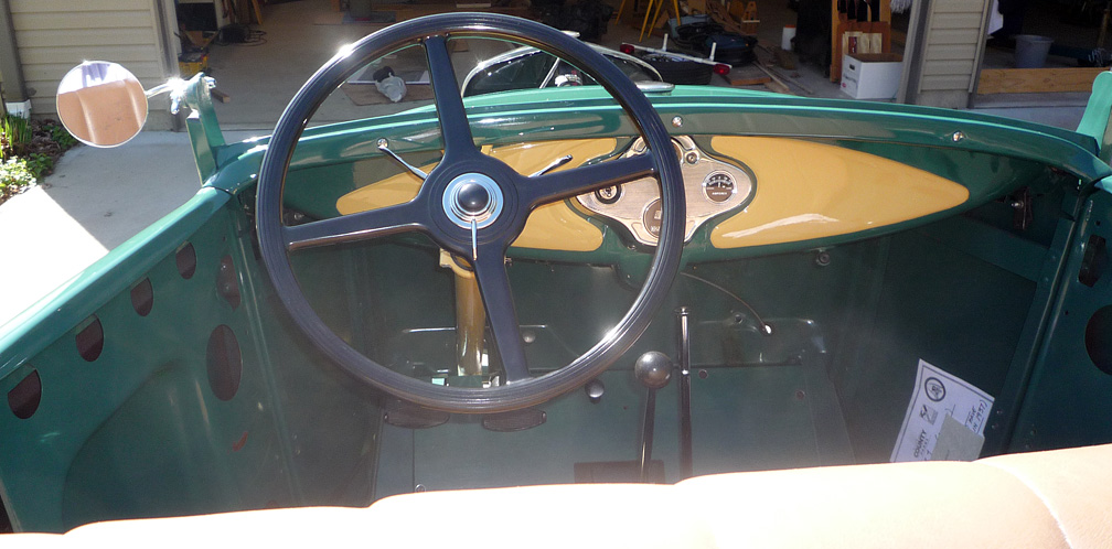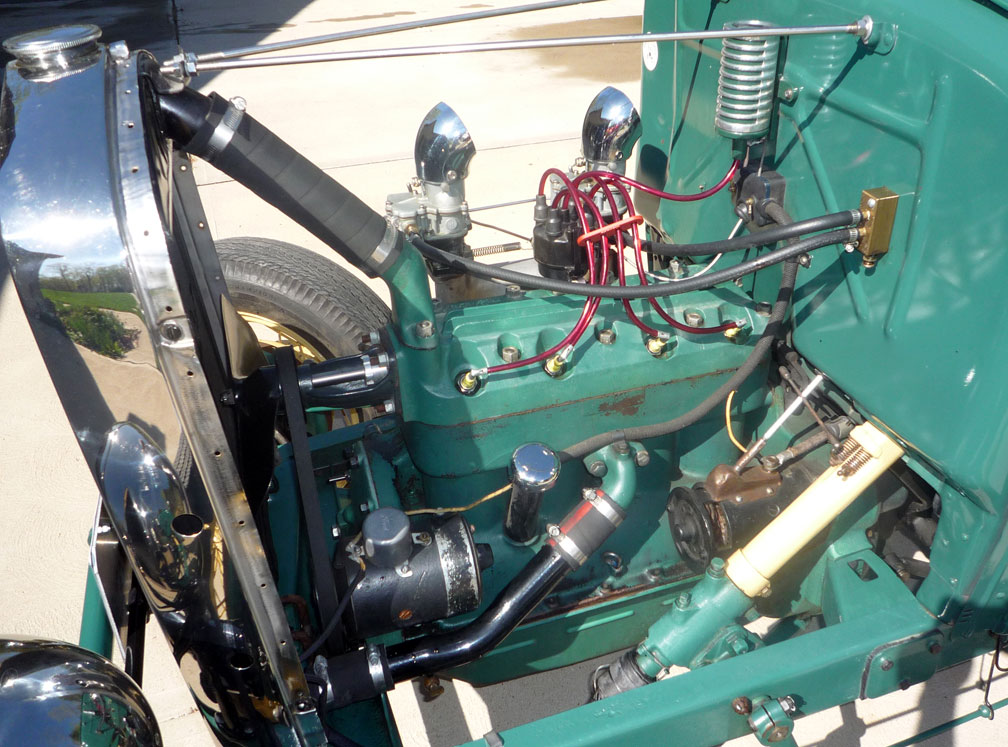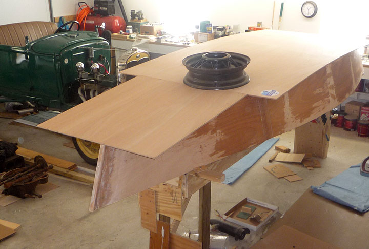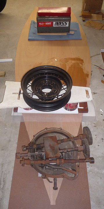 I had marked and cut the two pieces that will make up the boat's botttom, when Bill D. dropped by and offered his help (extra hands) finding the timing indent on SOUPER. Long story short -- between the two of us, we used the tool I had made to turn the engine with a socket wrench and found the timing indent. With that determined, we set the distributor cam and got the engine running. The engine sounded good and the carbs did not leak. I then returned to boat building.