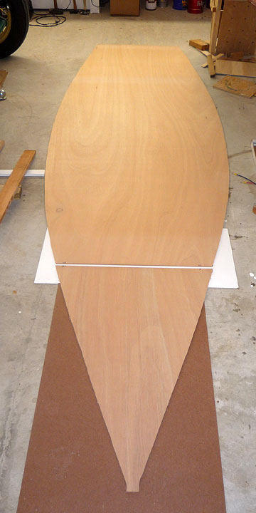 The boat was first centered on the strongback. Then the pieces needed for the bottom were caefully located, tacked in place, "cut lines" traced and registration marks made where the two pieces will be aligned and joined with 'glas tape.