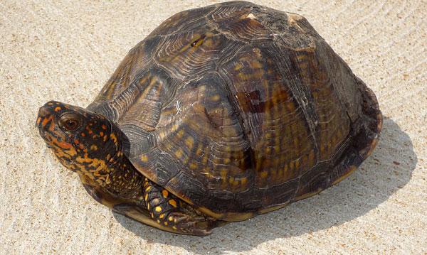 When I pulled in the driveway today, this fellow with a damaged shell was waiting for me. I have no idea where that moisture on his back originated.