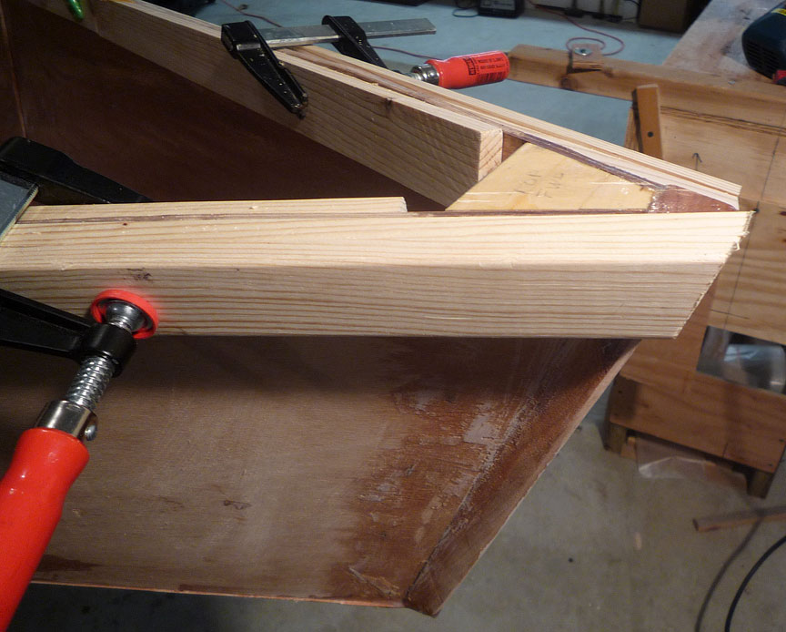 4/26/11 -- Returned SOUPER to 3103 after driving it to "regular" Tuesday lunch. Spent some time cleaning up the shop and routing the top ends of the butt splice scabs, so the inwales will lie flat. Carl offered his planer again, so I'll pick it up Thursday at his place.