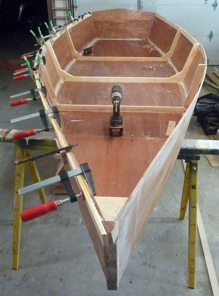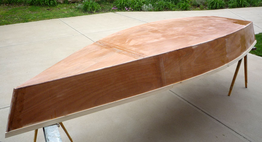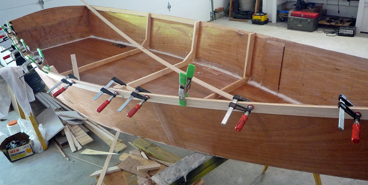 After MWC concert, went to shop and glued outer strip to port gunwale. Probably will glue outer strip to starboard gunwale tomorrow. Then there will be no excuse for not putting cloth on bottom. (But I have Senior Olympic event on Tuesday, and a skin cancer operation on Wednesday, so, who knows . . . )