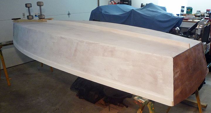 Used Titebond to glue second laminate on seat rails. Mocked up two seats (no pics) and gave the boat a coat of white primer on outside of hull. Ripped and planed some more keel stock, and built-up forward end of keel as described earlier. Fastened one pair of oarlocks to gunwales 12 inches behind main frame.