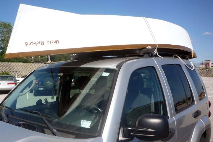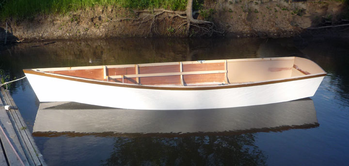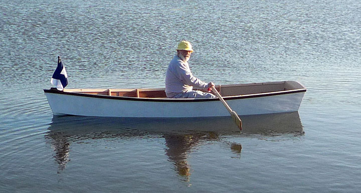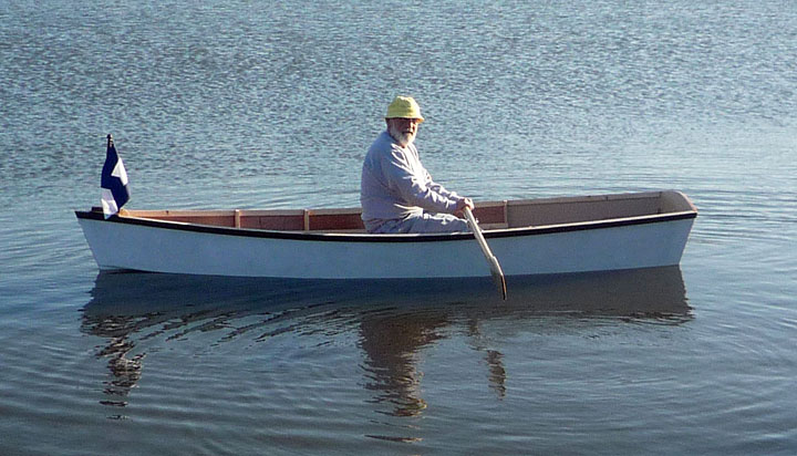 Launch day -- Notice how the keel just kisses the water when the boat is unloaded. The box provided a place to sit, so I could experiment with center seat (weight) and oarlock placement.