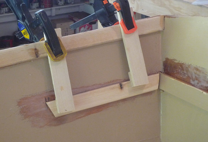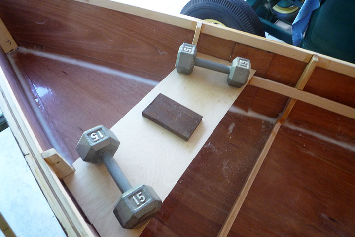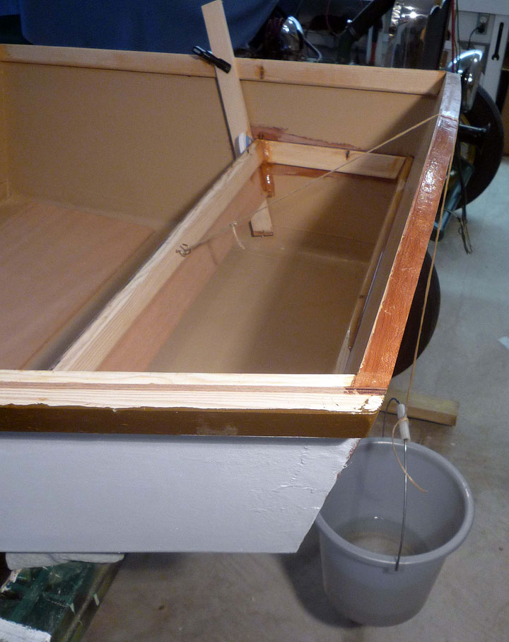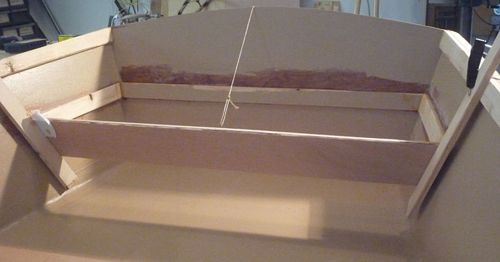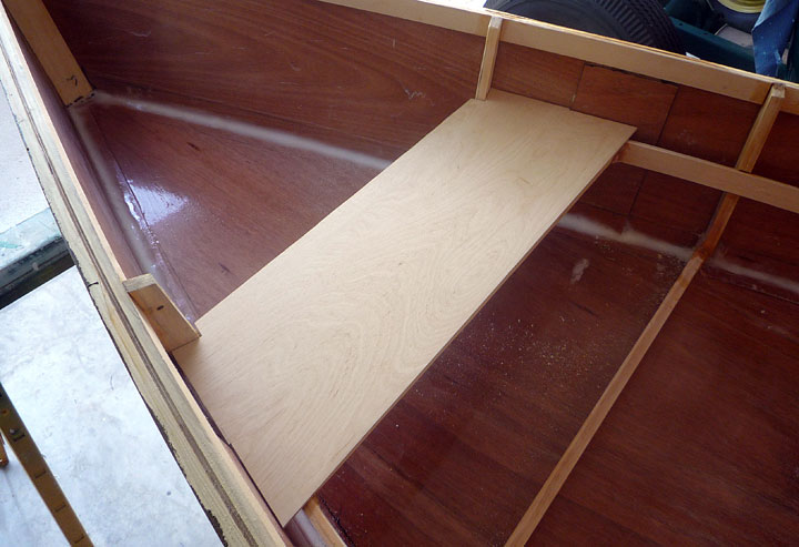 After lunch with airplane guys, I did a bit of work on the boat. Painted the bottom with another coat of Kilz. Sanded and filed the forward seat support joints. Made side supports for the aft seat. Mixed up some epoxy. Coated the bottom of forward seat, then thickened remainder of 3 oz. and glued the aft supports and the forward seat on its supports.