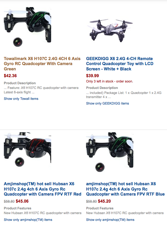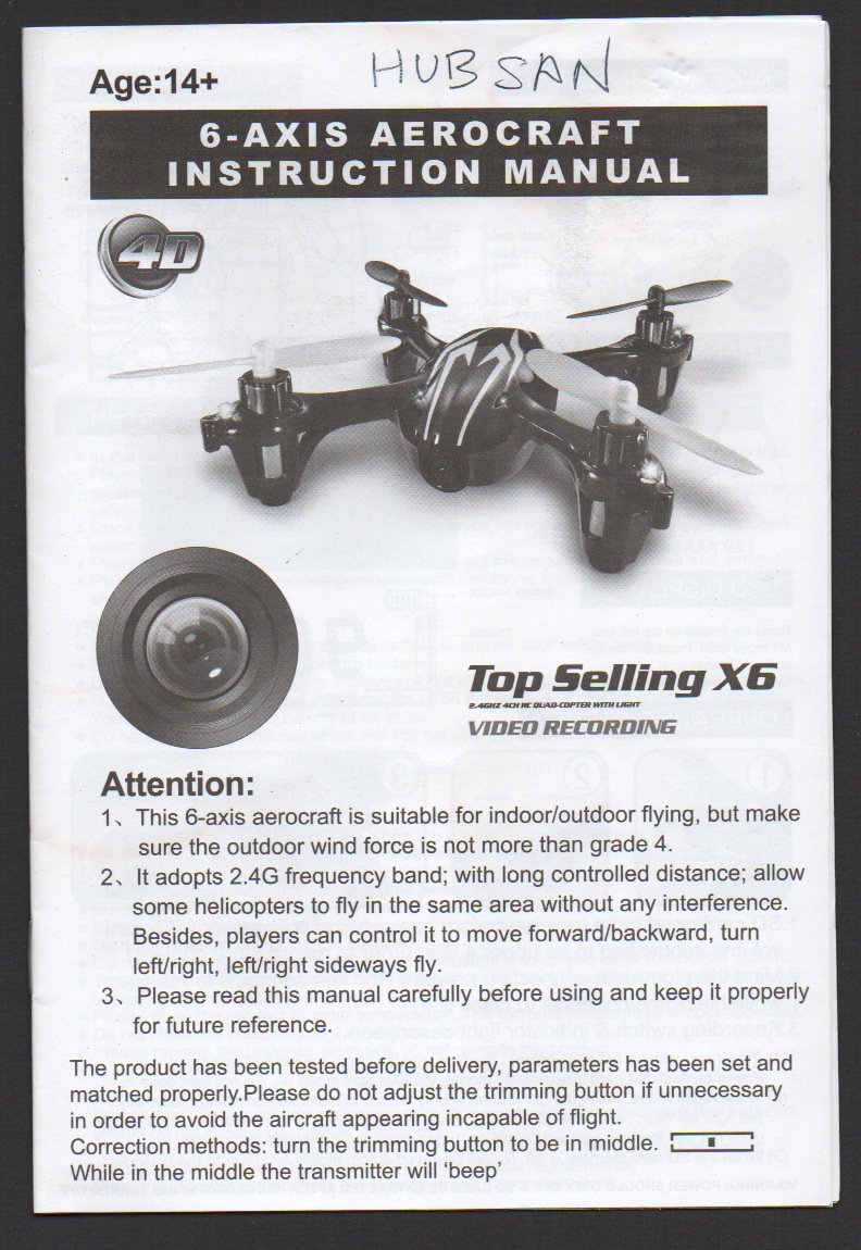 A small radio controlled "quadcopter" sold under various brand names. We bought ours on Amazon, and suspect it's a rip-off of a Hubsan X-4. It was shipped within a week or so by "FINEJO - Amazon Marketplace" but I kept receiving notice from Amazon that it would not arrive for 6 weeks or so. I told the seller "FINEJO" if I did not receive it by a date certain (about 14 days), I would cancel the order. But we received it in working condition, although very poorly packaged, via USPS.