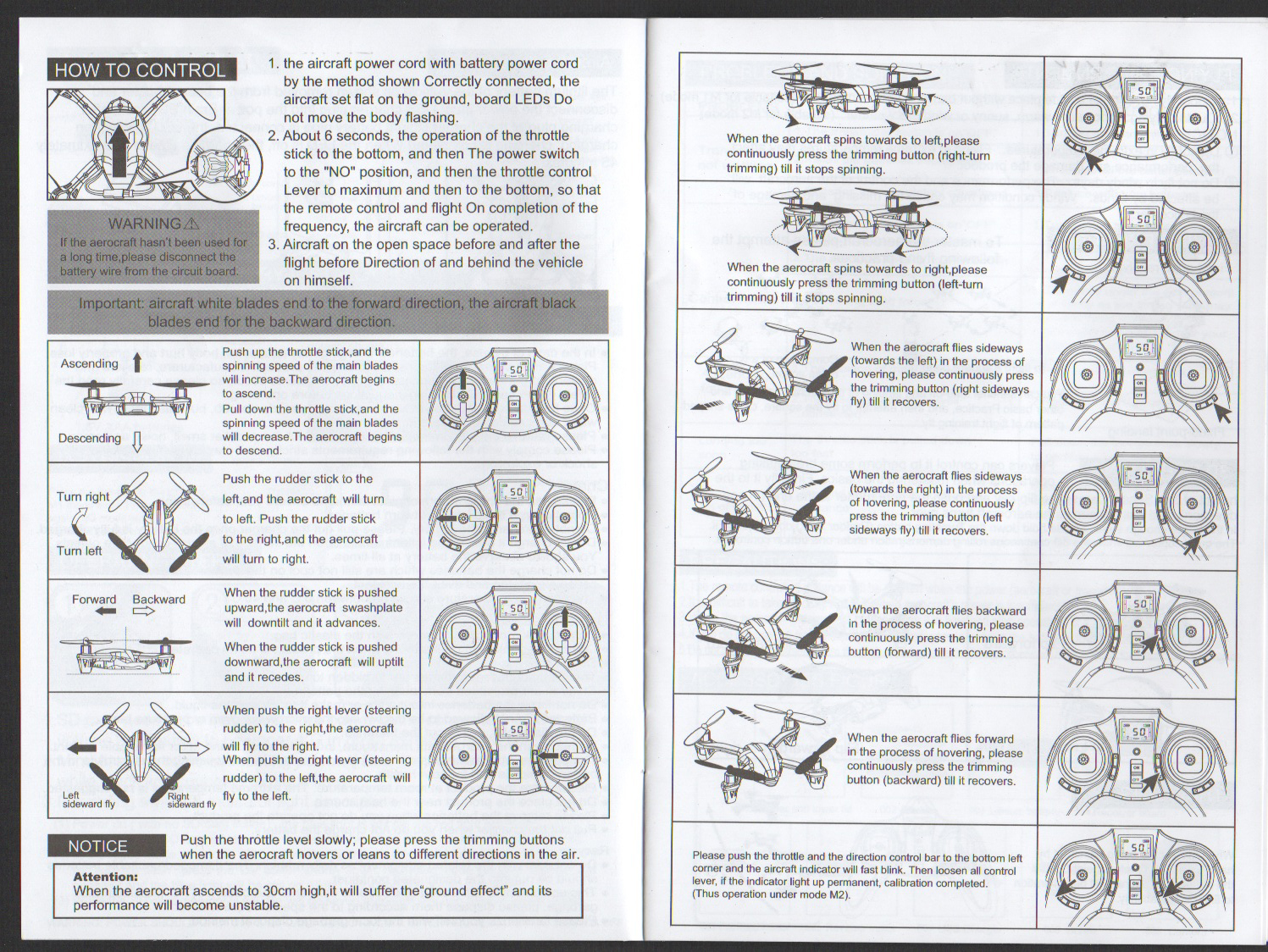 This was posted on Amazon . . . "Look carefully at the blades. you will notice that the two white blades slant in different directions. If the rear blades are correct then when you power it to take off the rear of the craft will want to lift and the front will want to dive, Or visa versa. If the front dives then just switch the 2 white blades with each other -- and visa versa if the rear is diving. Let me know if this helps. If not try to look on youtube for a video that will help you. The motors on the Hubsan turn in two directions when you apply thrust. In the front one motor turns clockwise and the other turns counter clockwise. same for the rear. this is to help stabilize the craft so it doesn't spin in the air. The motors essentially fight each other to keep the craft straight. this is why the white (front) blades are at different angle as are the black (rear) blades. This is so both blades are giving lift even though the motors are spinning in different directions. I know it's complicated, but once you understand it will make sense." Email Me!